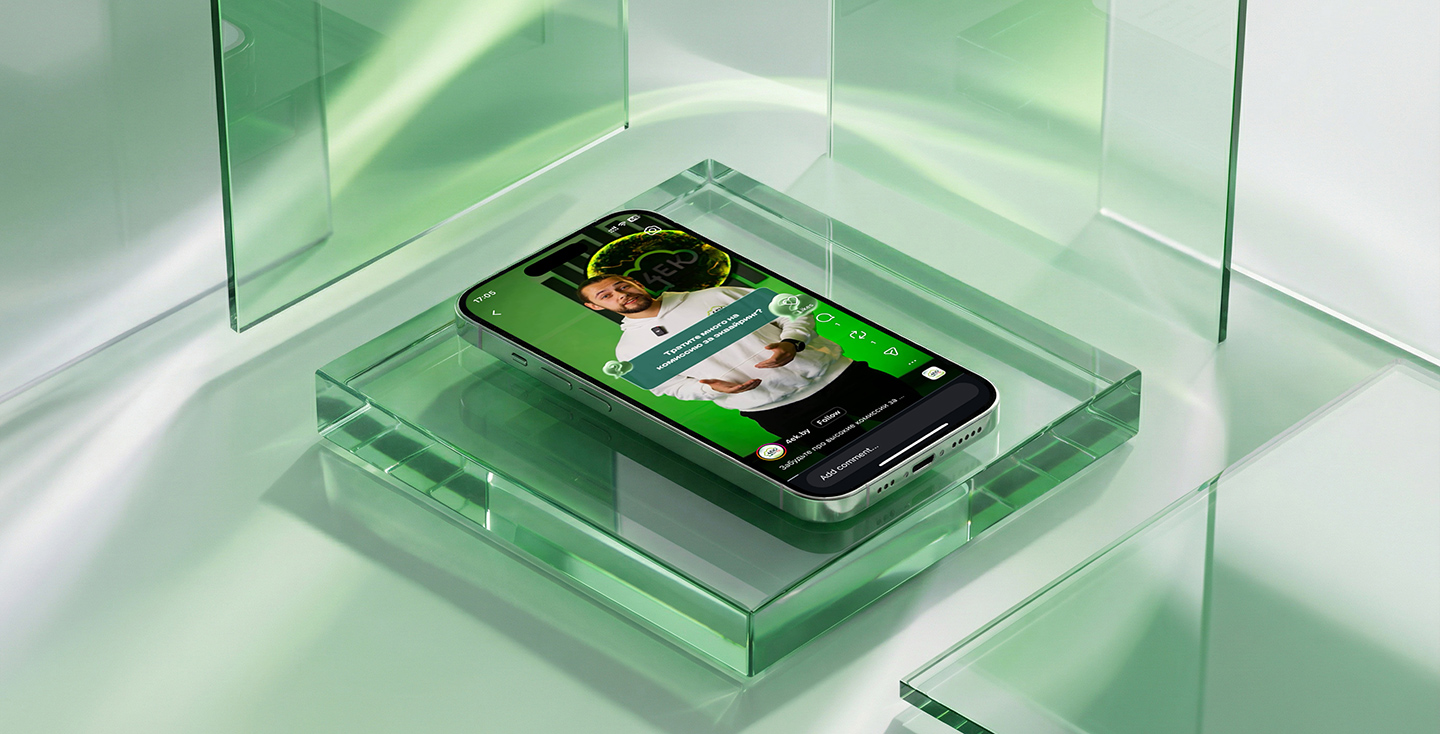 Помимо графических элементов, в контенте используются 3D-иконки, выполненные в том же стиле зеленого стекла: например, объемная касса, иконки оплаты, транспорт, торговые элементы и другие визуальные символы бизнеса. Благодаря этому весь контент выглядит единым и узнаваемым.
