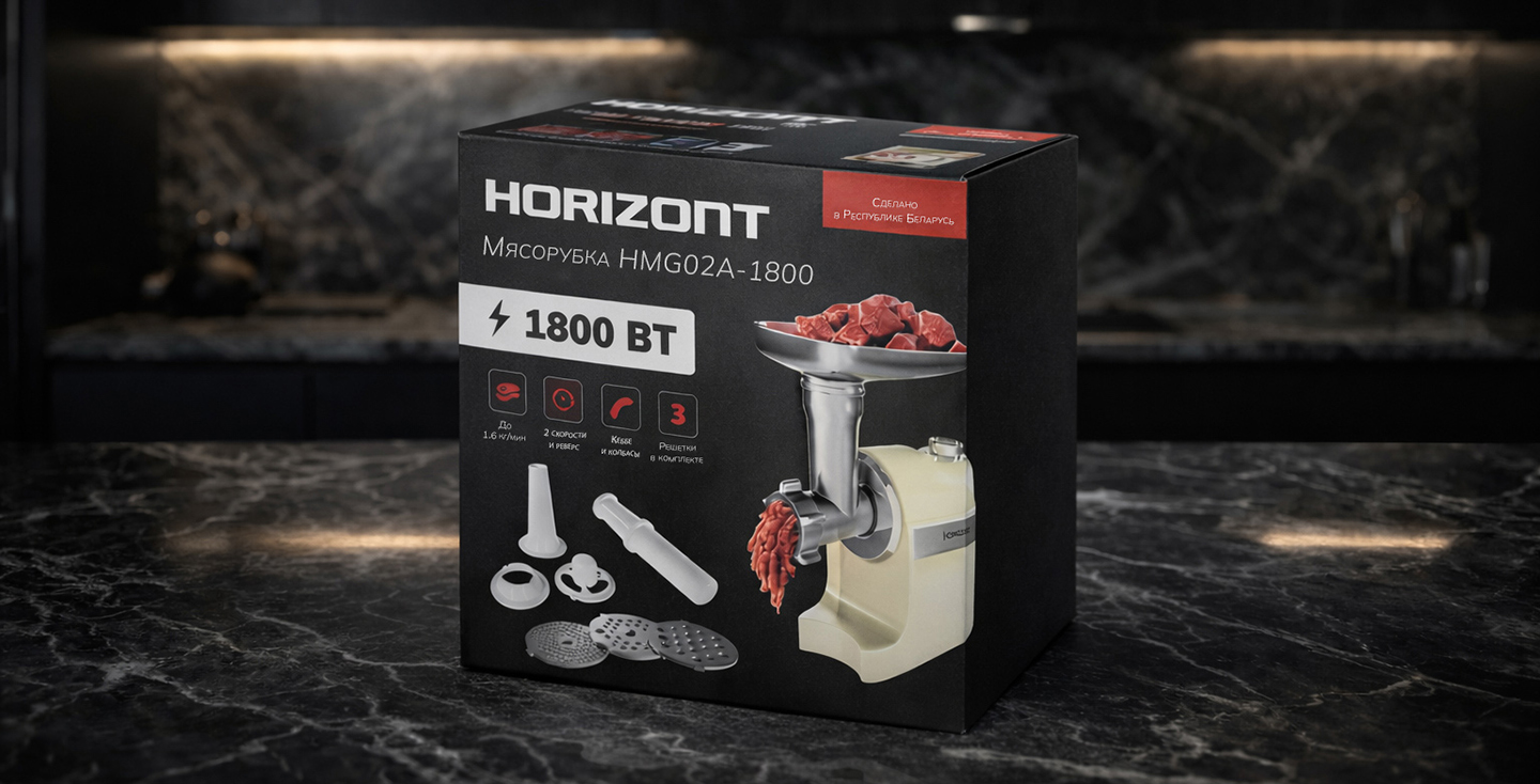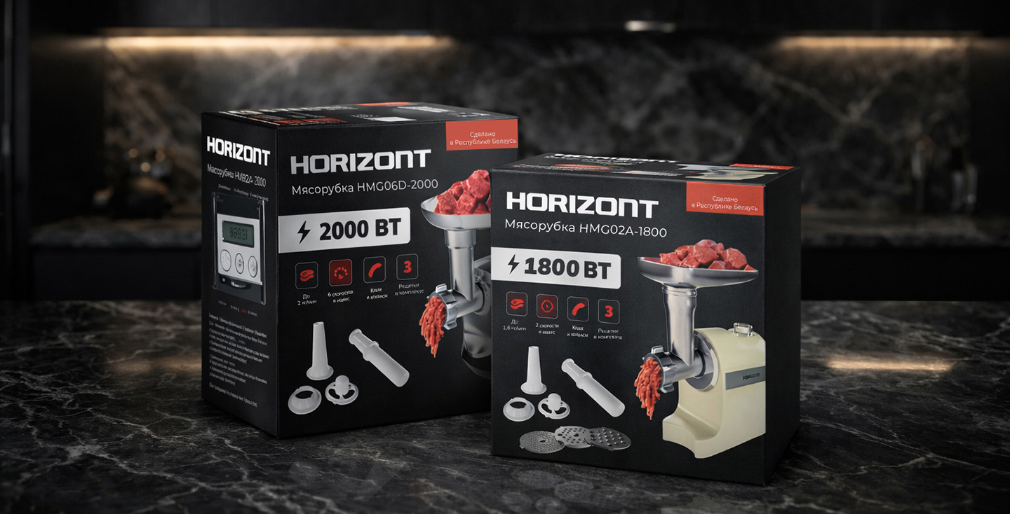 Компания HORIZONT обратилась к нашей команде с задачей разработки дизайна упаковки для линейки бытовой техники. В рамках проекта нашей команде предстояло разработать дизайн упаковки для линейки мясорубок HORIZONT HMG02A-1800 и HORIZONT HMG06D-2000.